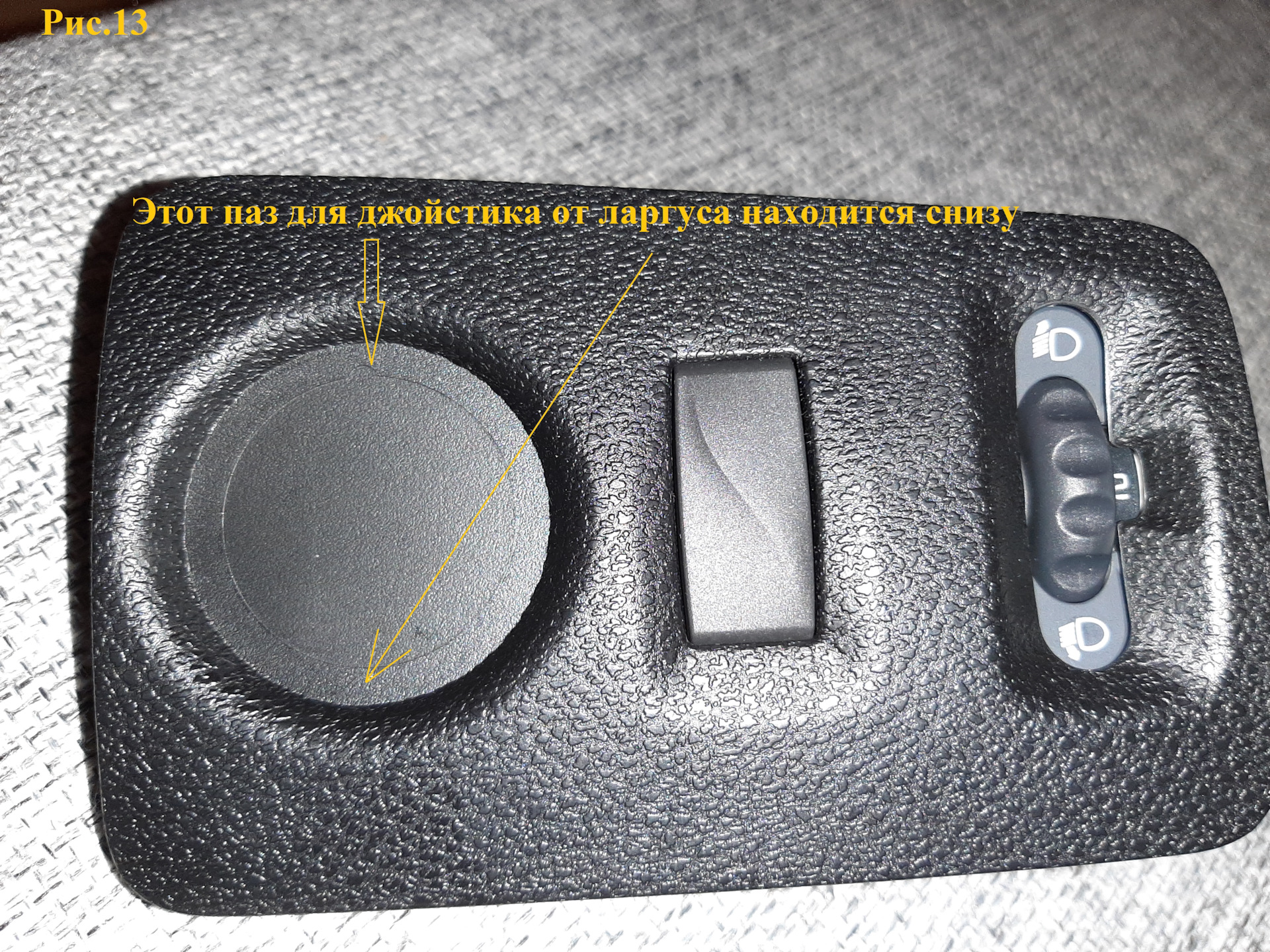 Монтаж джойстика. Извлекаем при помощи пластиковой лопатки блок управления, где находится корректор положения фар. Отключаем фишку питания корректора. На блоке, в месте установки джойстика есть контур выреза отверстия под джойстик: