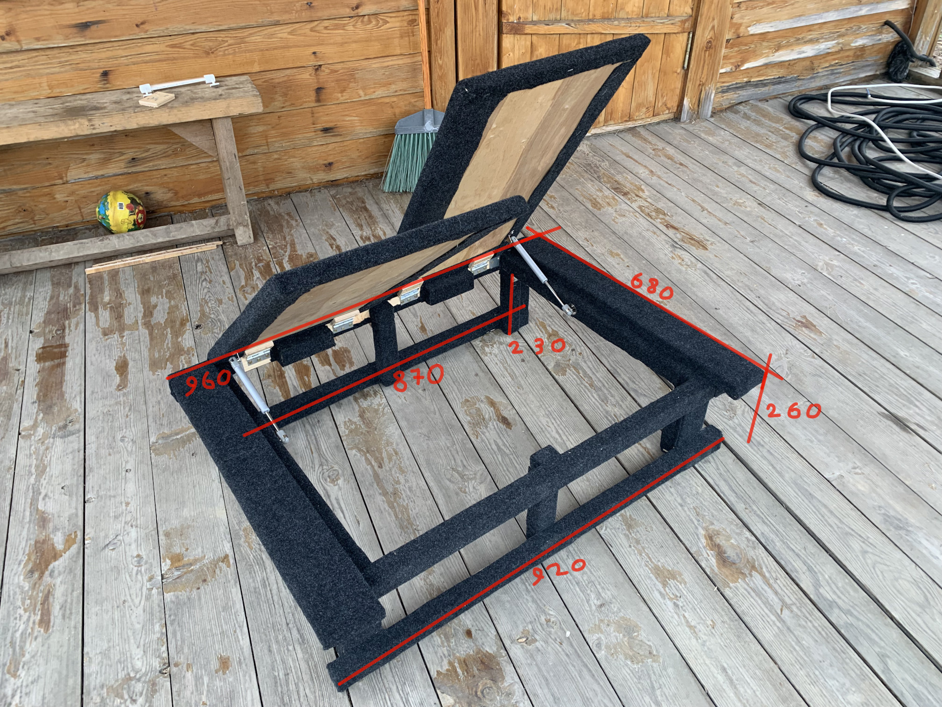 2. Изготовить крышки (вырезаем, зачищаем, делаем кромки). Крышки прикручены петлями. Установлены газлифты для удобства.