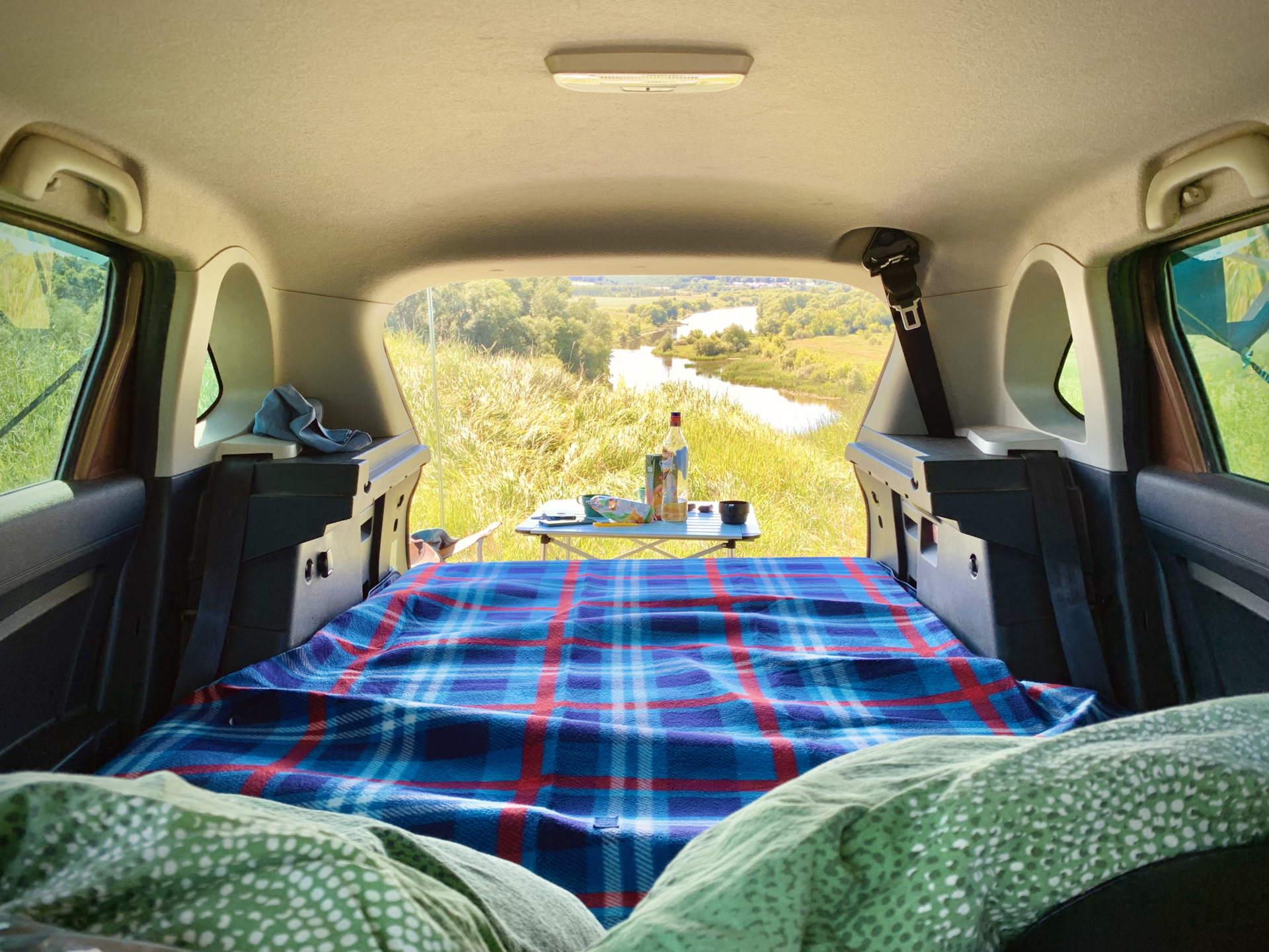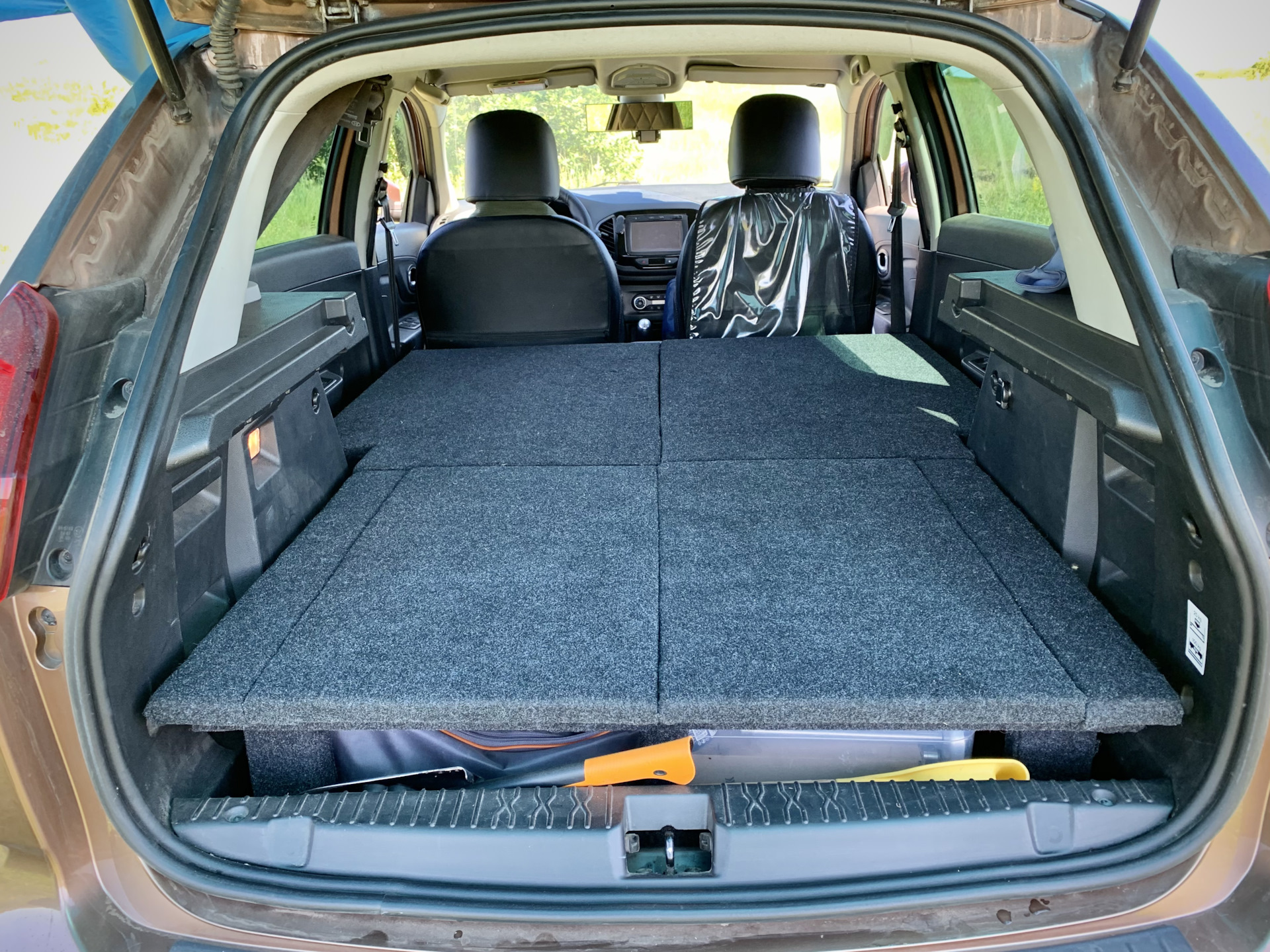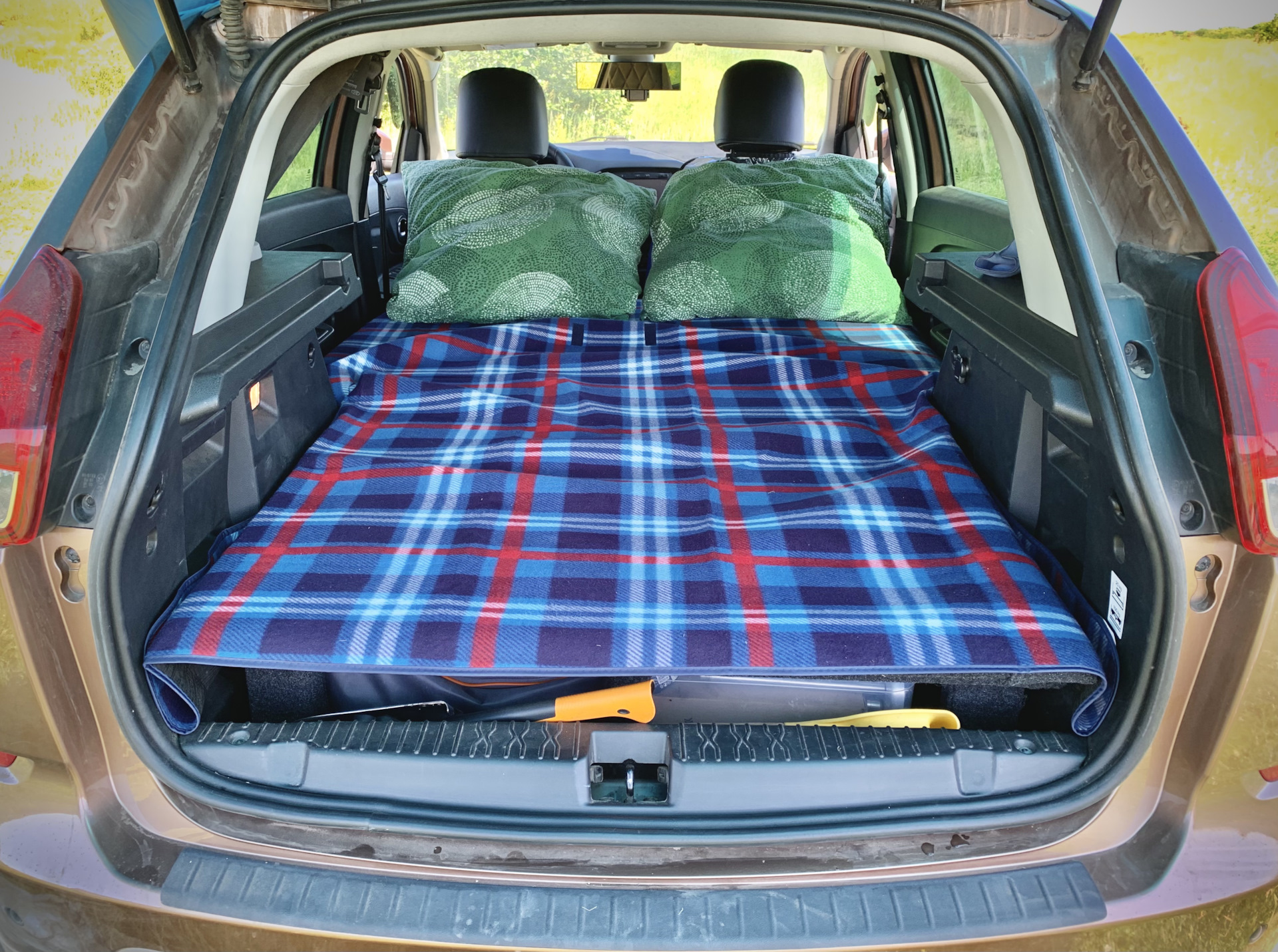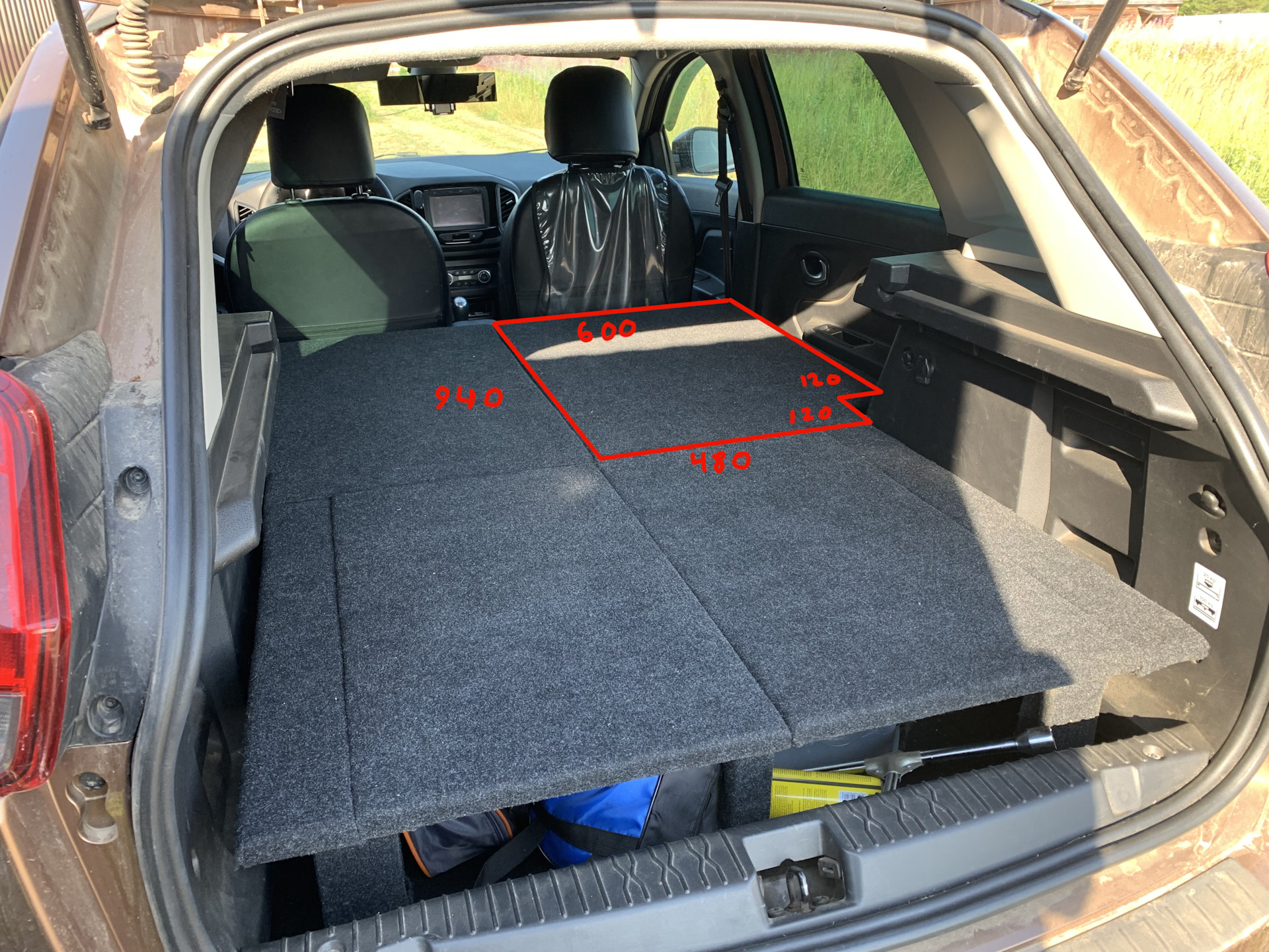 Если сложить задние сиденья Lada XRAY, то получаем площадку примерно 1.8 м длинной и 1.33 м шириной в районе дверей и 1.0 м в багажнике. Этого вполне достаточно для ночевки, только надо перекрыть пустоту, примерно 40 см.