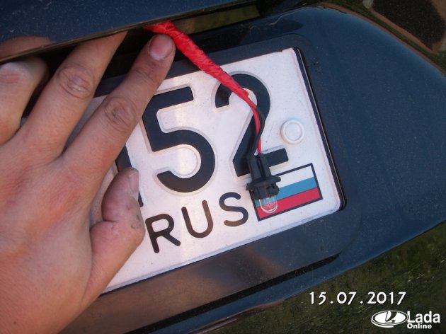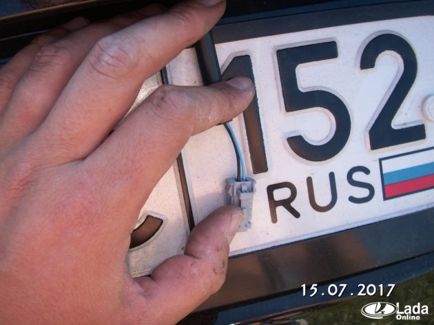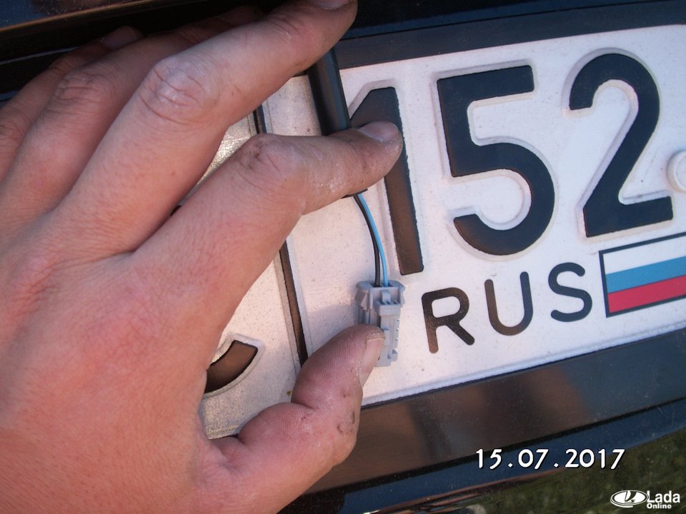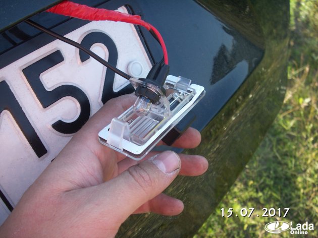 - в фонаре освещения номерного знака (снять плафон, вытащить лампу, сделать отверстие сверлом «на 6», убрать часть уплотнителя, установить камеру, обработать герметиком). Подробно на фото:
