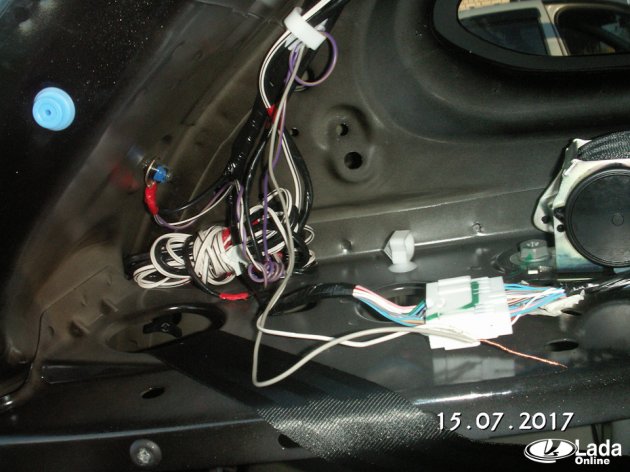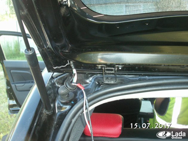3. Проводку от камеры прокладываем через гофру (дверь задка - крыша), затем под обшивкой потолка (отогнуть уплотнитель двери сверху), спускаем к блоку предохранителей под облицовкой левой стойки ветрового стекла (держится на клипсах), подводим к магнитоле (как снять магнитолу).