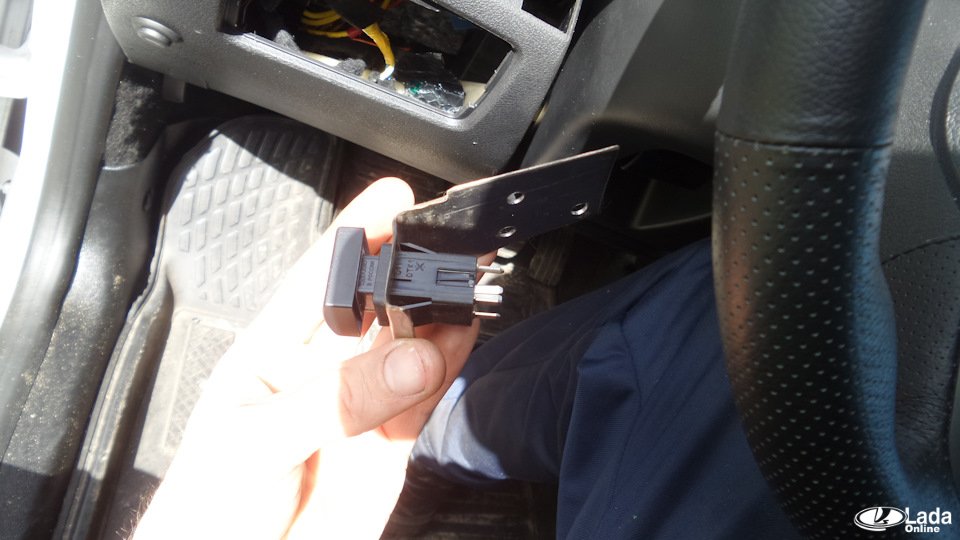Кнопку для ПТФ устанавливаем в салоне в любом удобном месте. В данном случае она была закреплена на панели при помощи самодельного кронштейна.