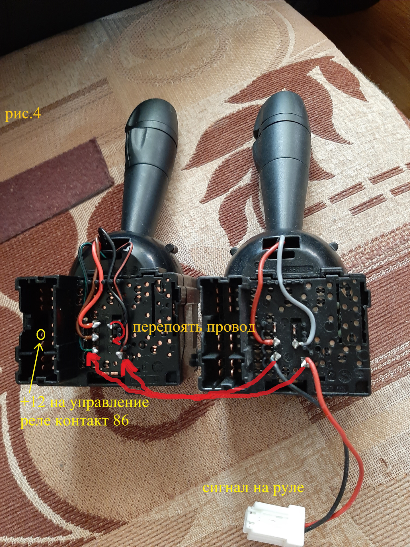 Для работы звукового сигнала с рулевого колеса, со снятого подрулевого переключателя необходимо перепаять фишку подключения звукового сигнала. Так же для корректного включения ПТФ при включенном ближнем свете перепаивается один провод.