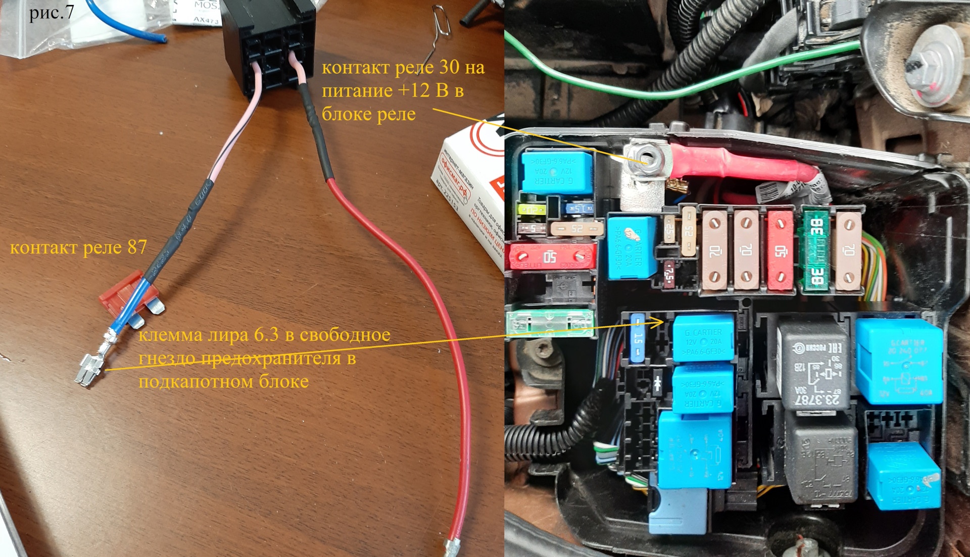 Провод управления реле протягивается в салон из подкапотного пространства, протянуть можно через заглушку тросика открытия капота.