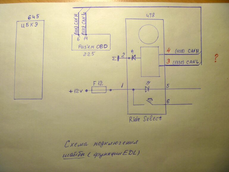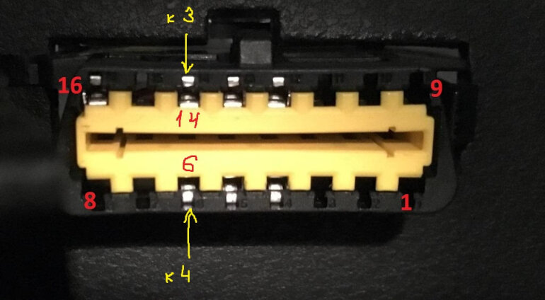 4. Подключить контакты OBD-II (№6 и №14) с контактами шайбы (№4 и №3)