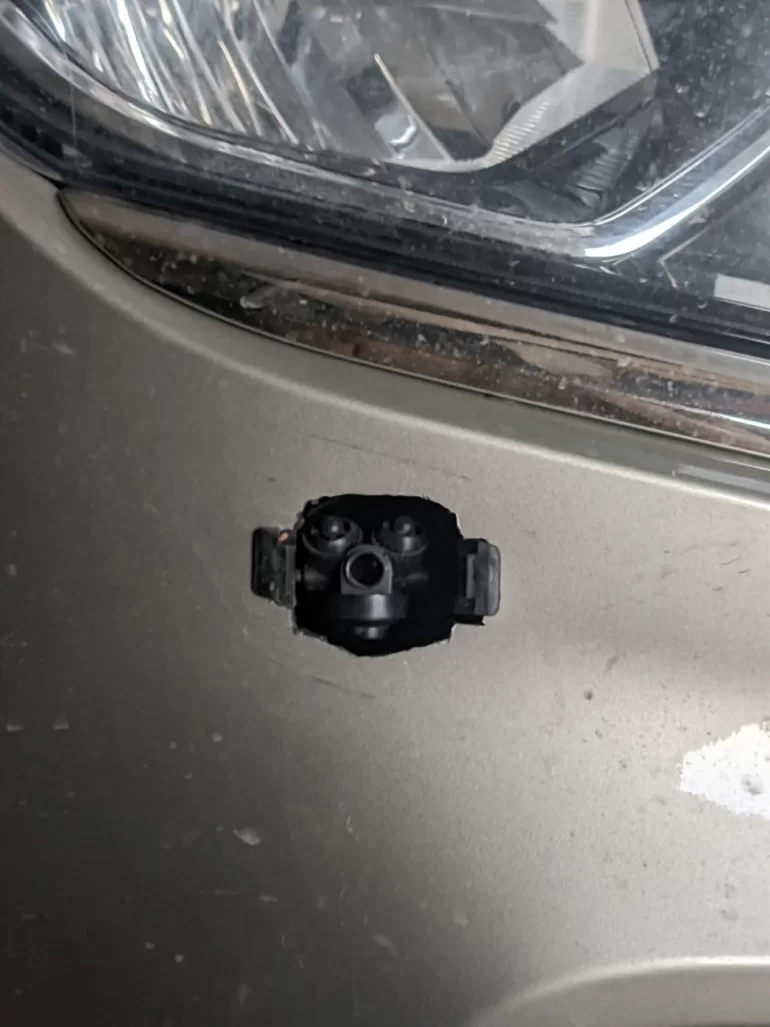 1. Сделать отверстие в бампере для установки форсунки. Сверлим выше усилителя бампера. Боковое крепление на форсунке было удалено, держится она только боковыми лапками, надевшись на края отверстия в бампере.