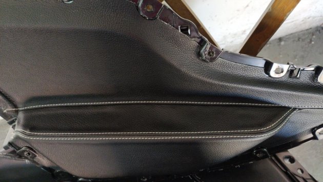 - Укладываем кожаные накладки на обшивку двери и выравниваем центральный шов. Можно зафиксировать материал прищепками, чтобы не сдвинуть шов.