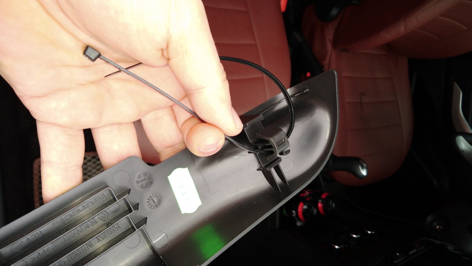 - Водительская накладка: вставить в пазы и зафиксировать саморезом. Чтобы закрепить часть, которая ближе к рулю, пришлось воспользоваться стяжками, т.к. на накладке есть пистон, а на сидении нет отверстия для крепления.