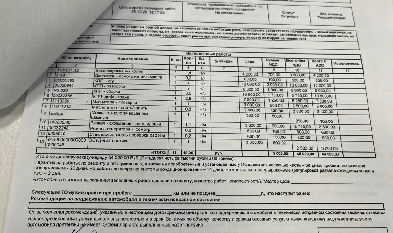 Сегодня был визит к ОД. В салоне родственнику предложили подписать договор-заказ-наряд на платный (!) ремонт на 54000 руб., сославшись на п. 3.6 гарантийного талона («Устранение неисправностей эксплуатации и работы, выполняемые по талонам технического обслуживания и контрольно-смотровых работ по состоянию ЛКП и антикоррозийного покрытия кузова производятся за счёт потребителя. За счёт потребителя производятся также диагностические работы, проводимые по его инициативе и не связанные с устранением неисправностей, возникших по вине изготовителя в период гарантии, эксплуатационные регулировки вследствие ненадлежащей эксплуатации автомобиля, воздействия внешних и других факторов, в том числе: прочистка топливной системы, регулировка углов установки колёс, регулировка двигателя, осмотр и регулировка тормозов, регулировка механизма сцепления»).