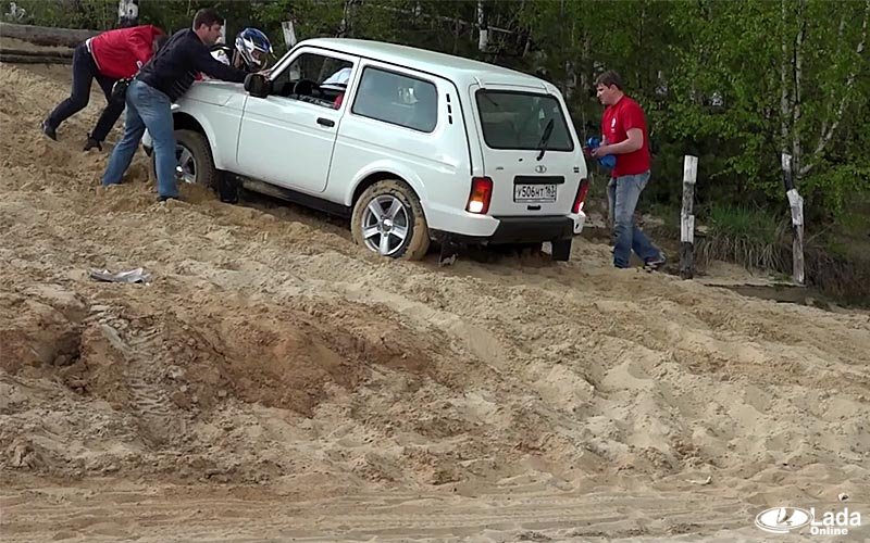3. Заезд на гору по песку. Шеви Нива взобралась выше всех. На 30-50 см ниже остановилась иномарка. Нива Урбан показала самый плохой результат, забравшись ниже всех. Кроме этого отечественный внедорожник зарылся в песке. Стоит отметить, что на Ниве Шевроле использовалась более цепкая резина, что существенно влияет на проходимость.