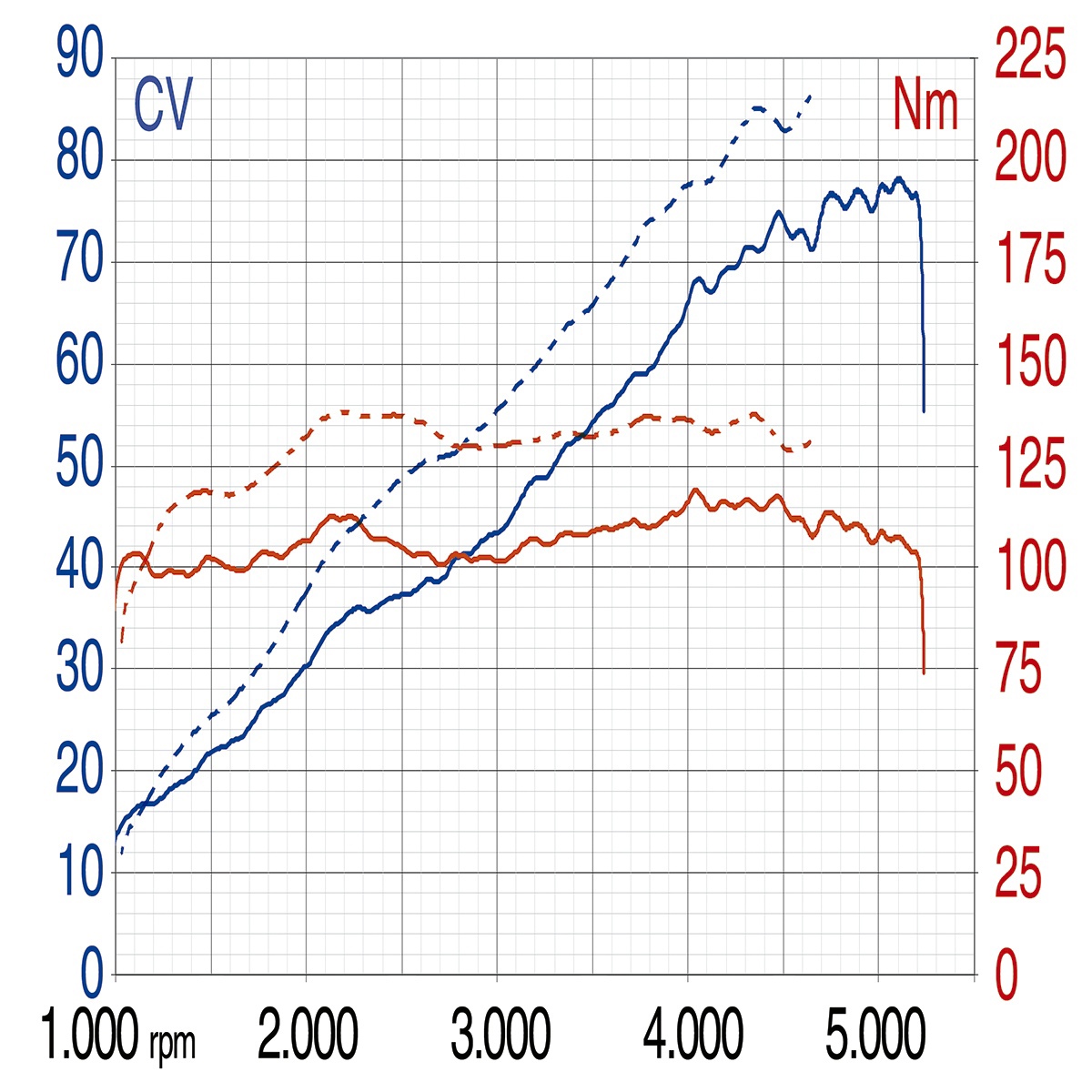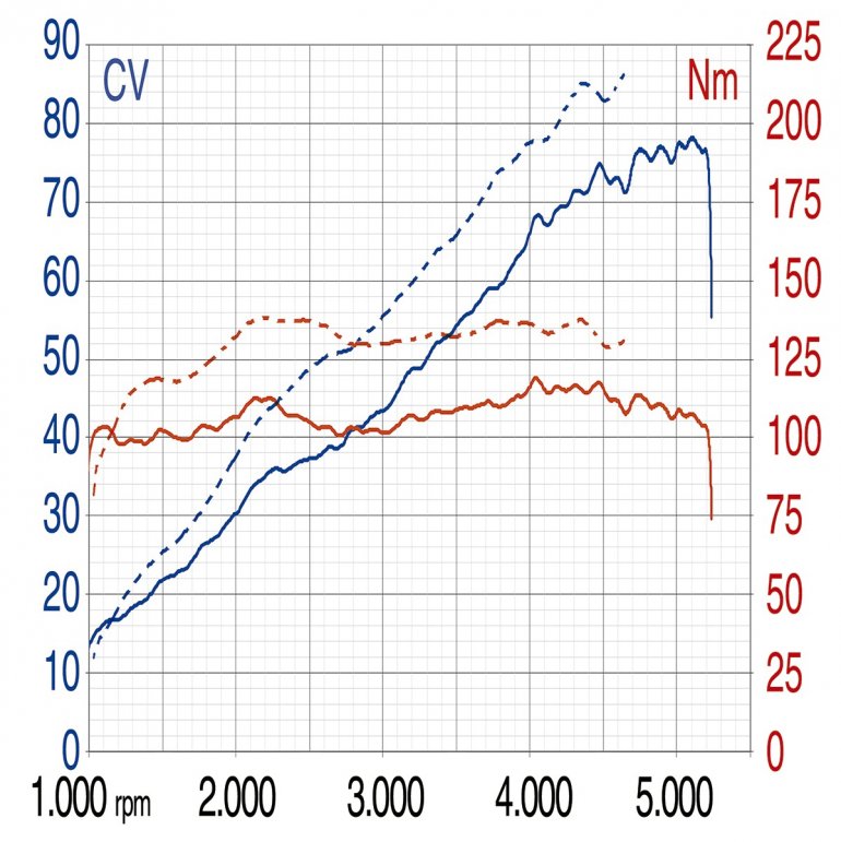 Двигатель с пробегом 3500 км показал очень ровную кривую крутящего момента, с хорошей реакцией на низких оборотах, особенно на холостом ходу, но максимальное значение (118 Нм) слишком низкое в абсолютном значении. Низкую мощность также следует отнести на счет строгих ограничений Euro-5. График для сравнения в виде пунктира - это тесты Нивы с ограничениями Euro-3.