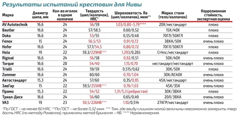 Вывод: Совсем уж провальные данные в таблице выделили красным цветом. В целом радоваться нечему. На общем фоне лучше других показали себя крестовины Bautler и Trialli. А тем, кто захочет кардинально решить проблему с крестовинами, можем посоветовать перейти на ШРУСы: подходящие комплекты для нивоводов, эксплуатирующих машины прежнего выпуска, есть в продаже.