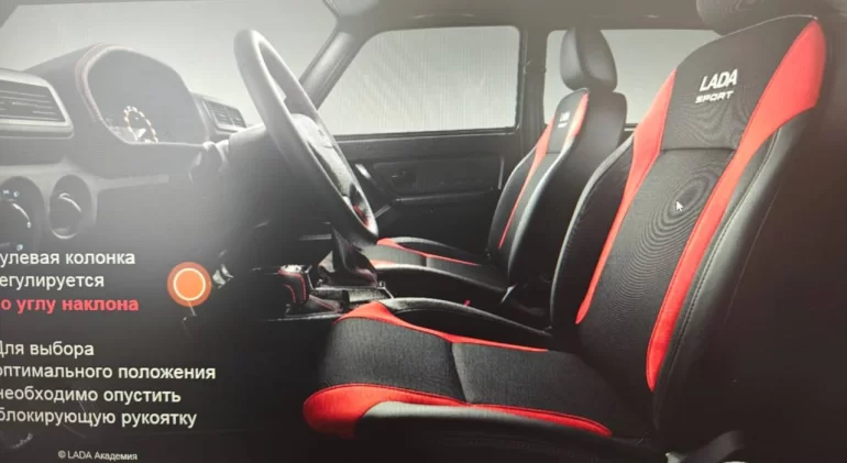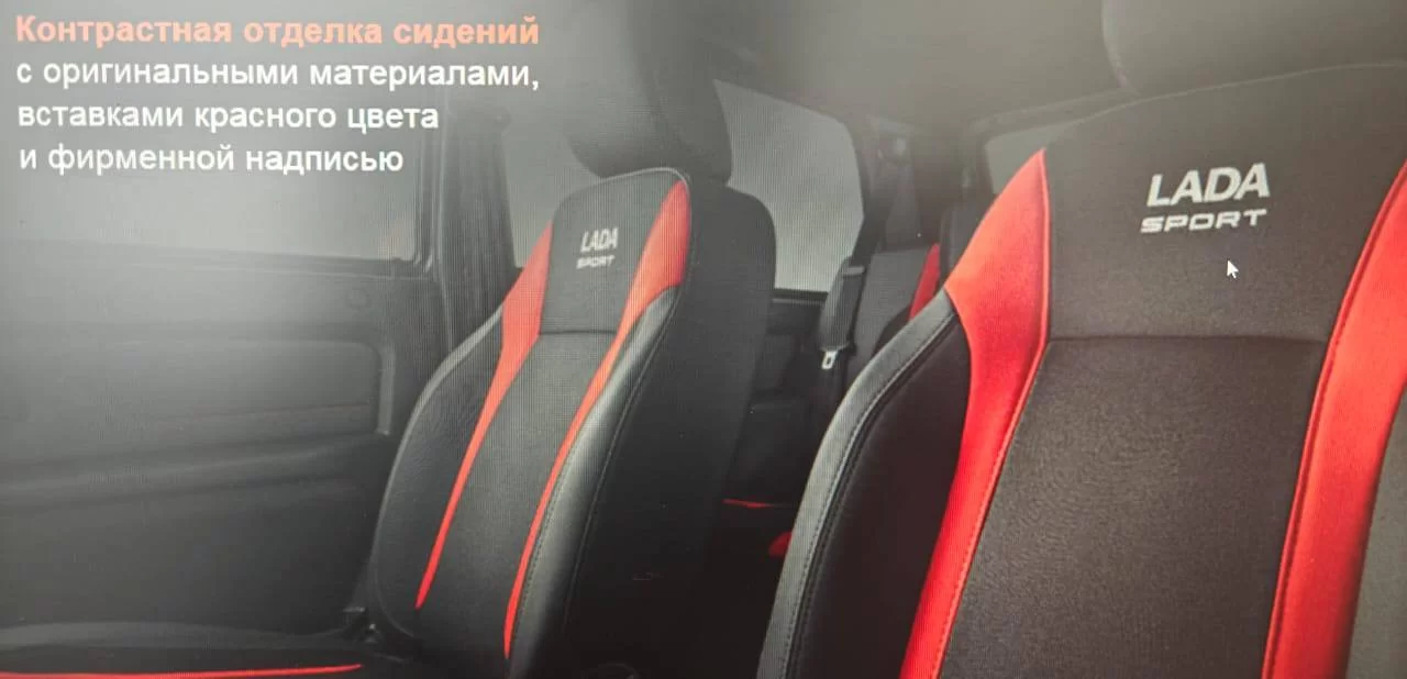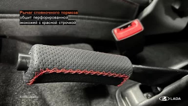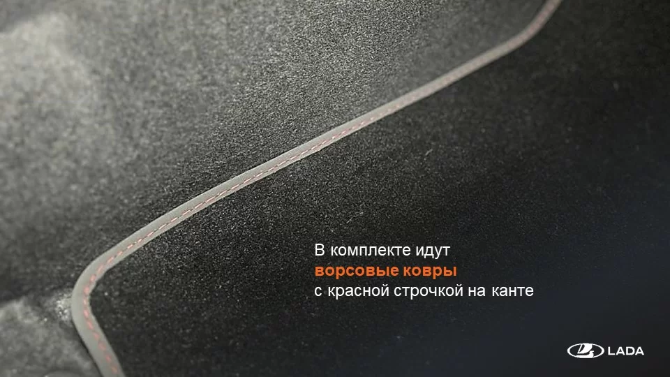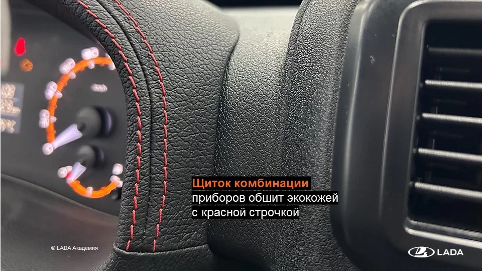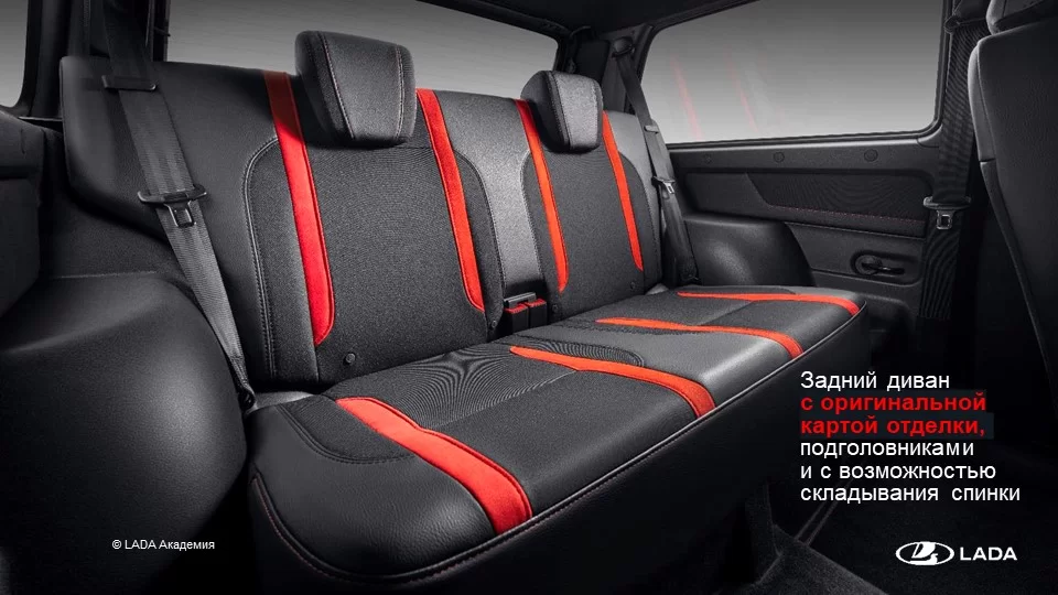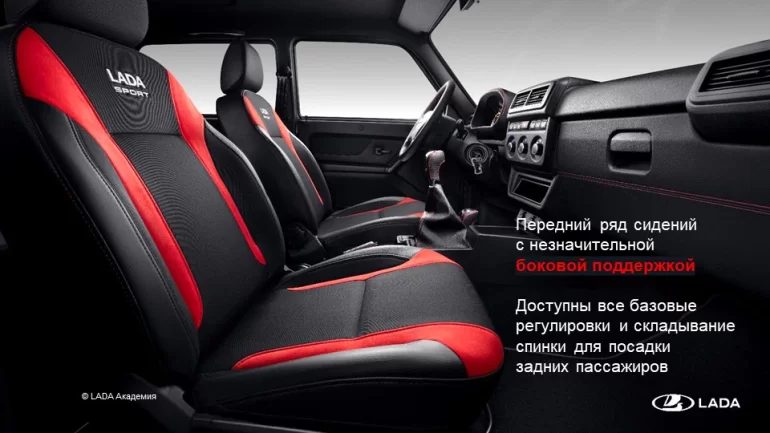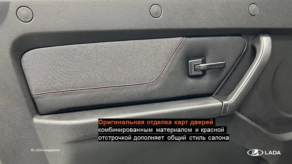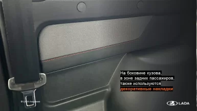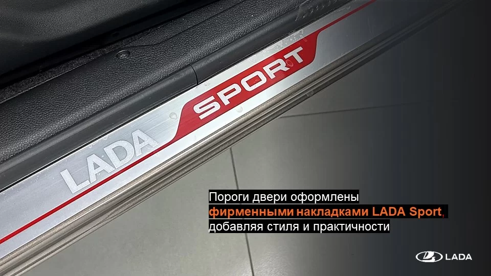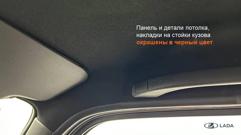 Панель и детали потолка, накладки на стойки кузова окрашены в черный цвет. Пороги двери оформлены фирменными накладками LADA Sport добавляя стиль и практичность.