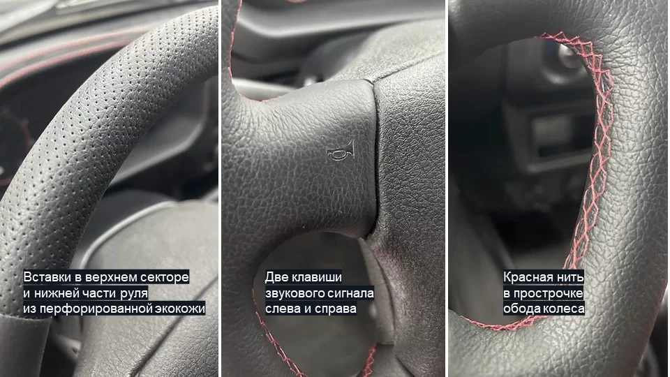 Вставки в верхнем секторе и нижней части руля из перфорированной экокожи. Две клавиши звукового сигнала слева и справа. Красная нить в прострочке обода колеса.