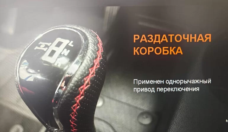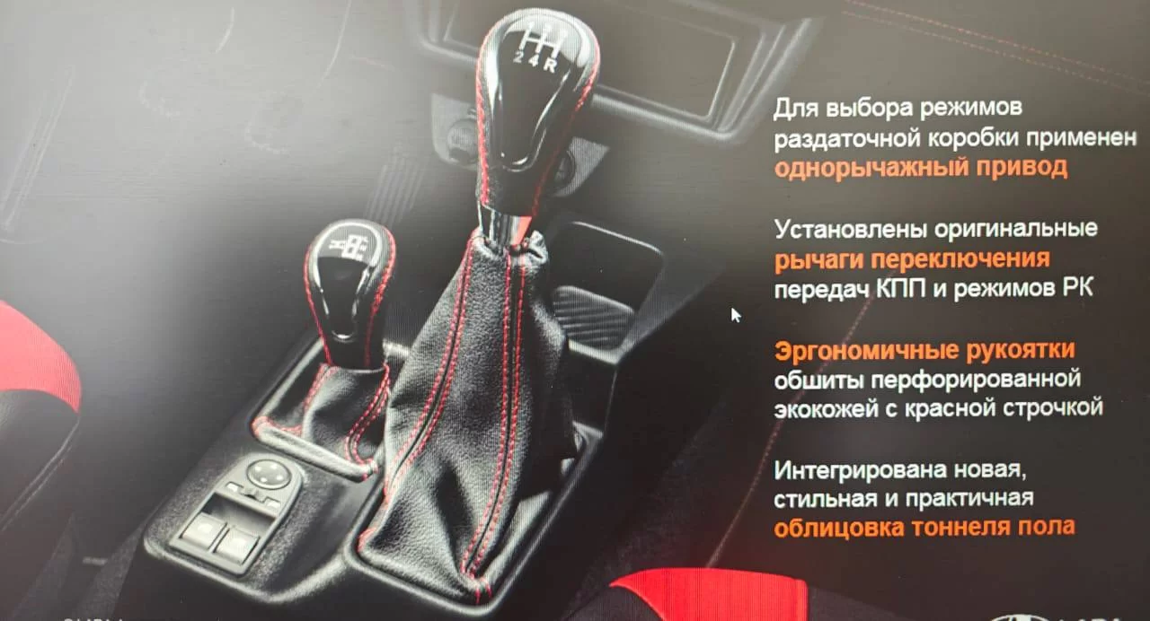 Для выбора режимов раздаточной коробки применен однорычажный привод. Установлены оригинальные рычаги переключения передач КПП и режимов РК. Эргономичные рукоятки обшиты перфорированной экокожей с красной строчкой. Интегрирована новая, стильная и практичная облицовка тоннеля пола.