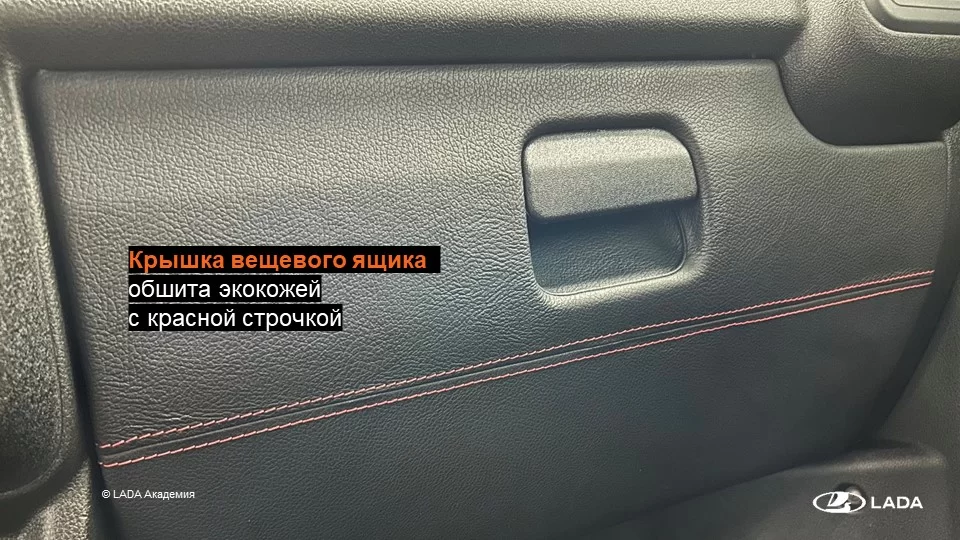 Щиток комбинации приборов, крышка бардачка, рычаг стояночного тормоза обшита экокожей с красной строчкой.