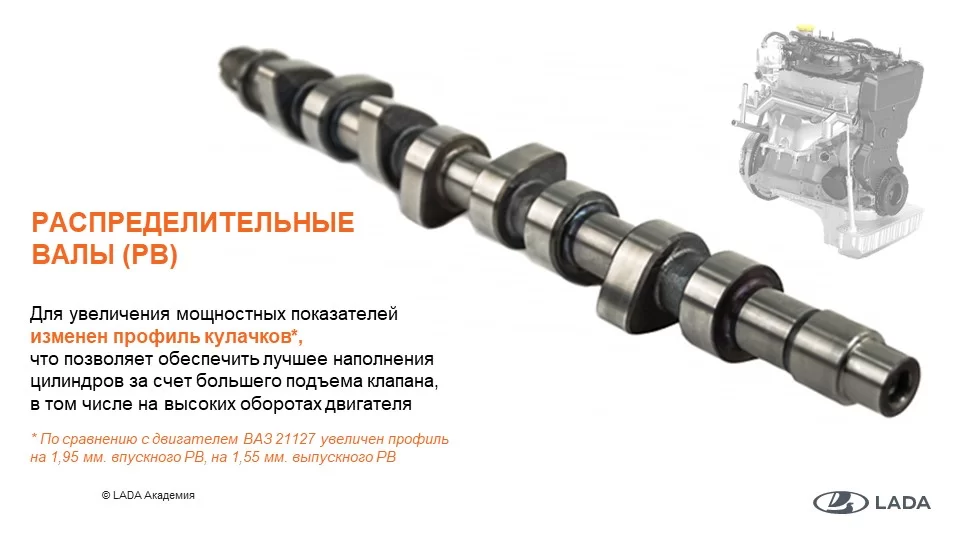 Распредвалы (РВ). Для увеличения мощностных показателей изменен профиль кулачков, что позволяет обеспечить лучшее наполнения цилиндров за счет большего подъема клапана, в том числе на высоких оборотах двигателя (по сравнению с двигателем ВАЗ 21127 увеличен профиль на 1,95 мм. впускного РВ, на 1,55 мм. выпускного РВ)