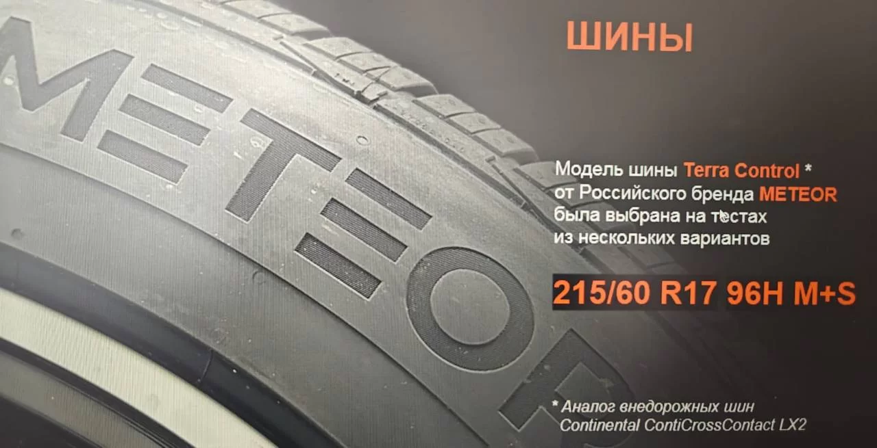 Еще одно отличие от обычной Нивы — шины. Модель шины Terra Control (аналог внедорожных шин Continental ContiCrossContact LX2) от Российского бренда METEOR была выбрана на тестах из нескольких вариантов 215/60 R17 96Н M+S.