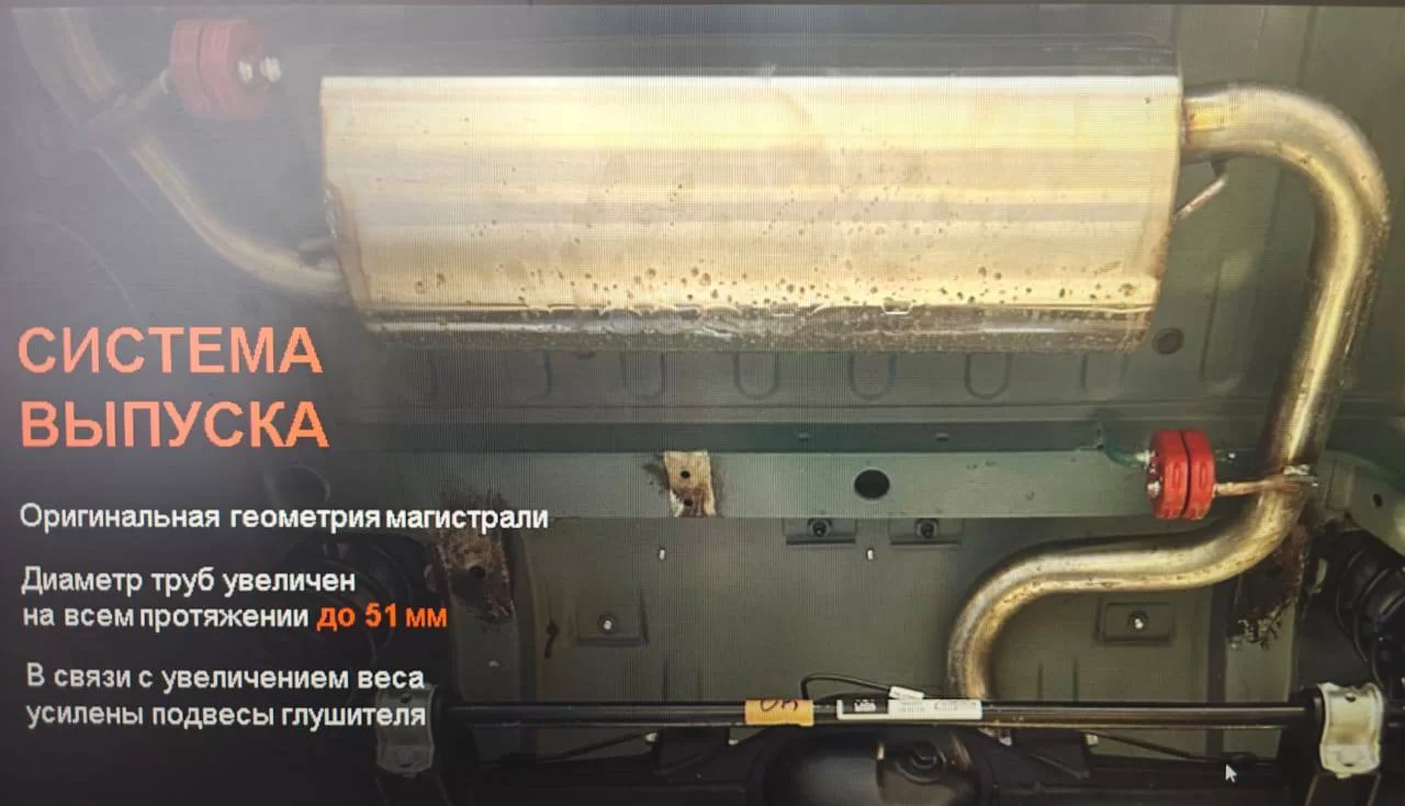 Оригинальная геометрия магистрали. Различия с обычной Нивой в диаметре труб, которые увеличены на всем протяжении до 51 мм. В связи с увеличением веса усилены подвесы глушителя.