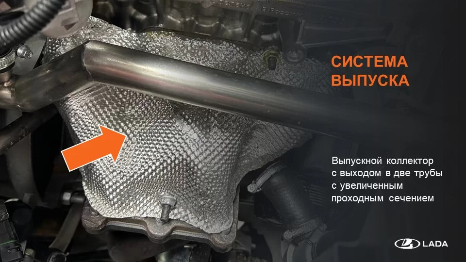 Выпускной коллектор с выходом в две трубы с увеличенным проходным сечением.