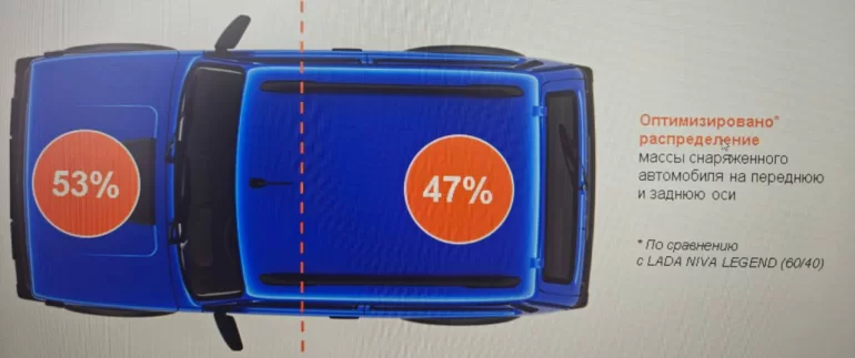 Оптимизировано распределение массы снаряженного автомобиля на переднюю и заднюю оси (по сравнению С LADA NIVA LEGEND (60/40)).
