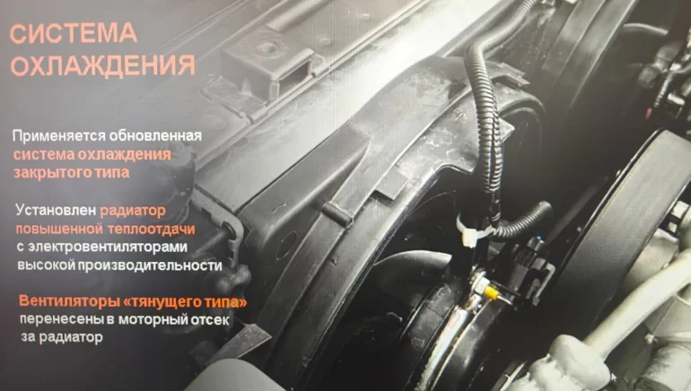 Применяется обновленная система охлаждения закрытого типа. Установлен радиатор повышенной теплоотдачи с электровентиляторами высокой производительности. Вентиляторы «тянущего типа» перенесены в моторный отсек за радиатор.
