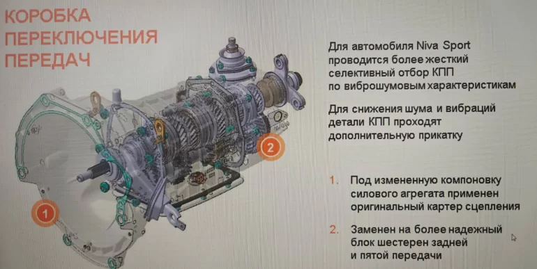 Для автомобиля Niva Sport проводится более жесткий селективный отбор КПП по виброшумовым характеристикам. Для снижения шума и вибраций детали КПП проходят дополнительную прикатку: