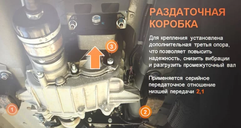 Для крепления установлена дополнительная третья опора, что позволяет повысить надежность, снизить вибрации и разгрузить промежуточный вал. Применяется серийное передаточное отношение низшей передачи 2,1