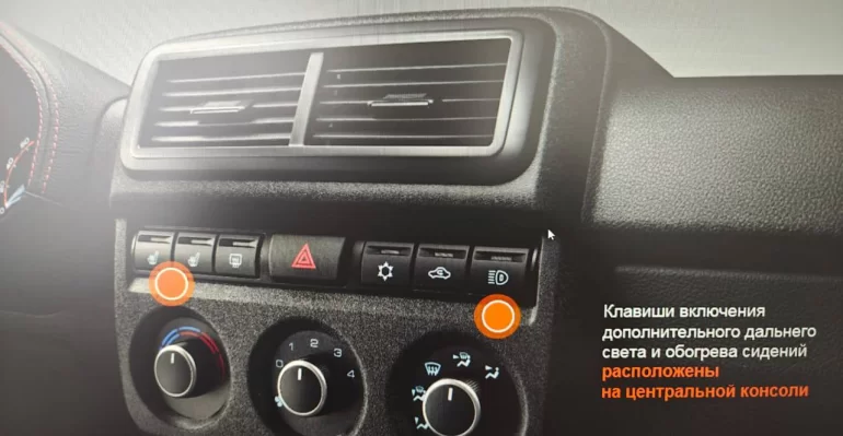 По сравнению с обычной Нивы тут клавиши включения дополнительного дальнего света и обогрева сидений расположены на центральной консоли.