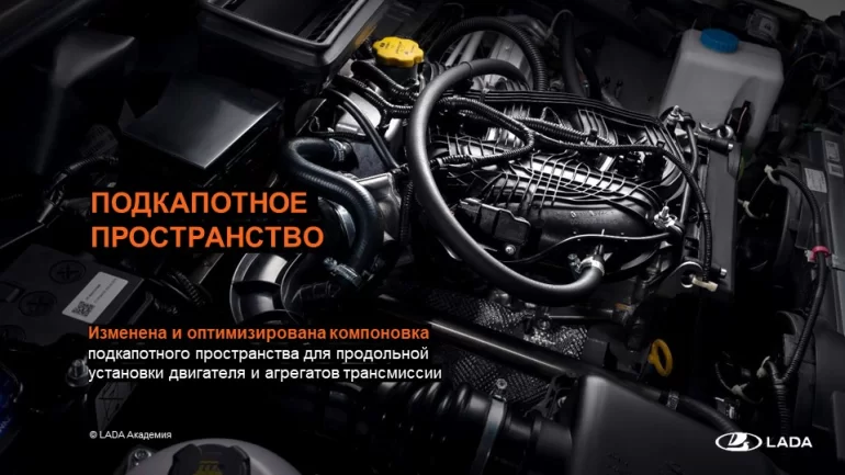Изменена и оптимизирована компоновка подкапотного пространства для продольной ’установки двигателя и агрегатов трансмиссии.