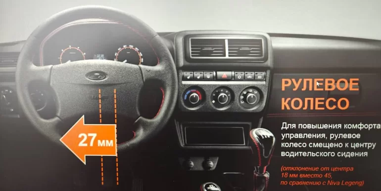 Для повышения комфорта и управления рулевое колесо смещено к центру водительского сидения (отклонение от центра 18 мм вместо 45, по сравнению с Niva Legeng).