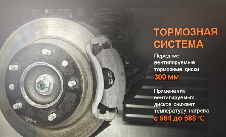 Передние вентилируемые тормозные диски 300 мм. Применение вентилируемых дисков снижает температуру нагрева с 964 до 688 °С.