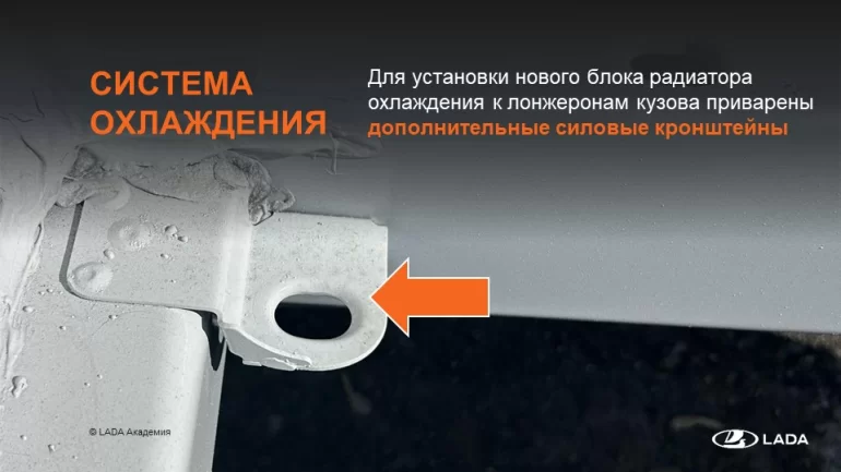 Для установки нового блока радиатора охлаждения к лонжеронам кузова приварены дополнительные силовые кронштейны.