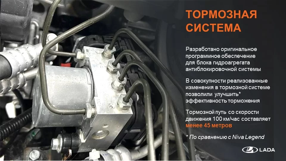Разработано оригинальное программное обеспечение для блока гидроагрегата антиблокировочной системы. В совокупности реализованные изменения в тормозной системе позволили улучшить эффективность торможения по сравнению с обычной Niva Legend. Тормозной путь со скорости движения 100 км/час составляет менее 45 метров.