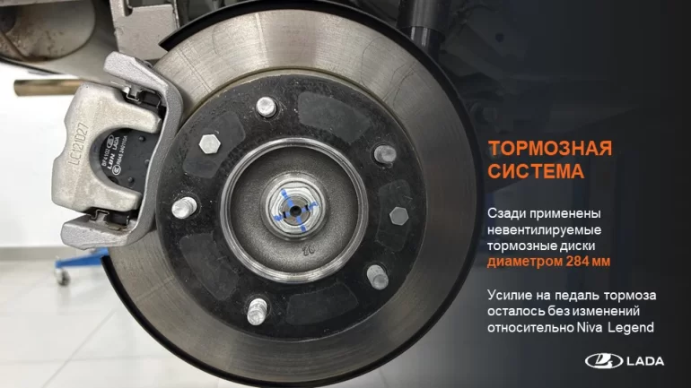 Сзади применены невентилируемые тормозные диски диаметром 284 мм. Усилие на педаль тормоза осталось без изменений относительно Niva Legend.