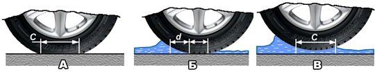 На сухой дороге (рис. А) пятно контакта шины с покрытием составляет величину С. На мокрой дороге эта величина уменьшается на величину d из-за появления водяного клина. Водяной клин образуется из воды, выдавленной из под колеса в процессе движения.(рис. Б) По мере увеличения скорости движения увеличивается количество выдавленной воды. Водяной клин растет - шина все больше всплывает над дорожным покрытием. Когда скорость движения достигнет критического значения и между шиной и покрытием будет сплошной слой воды - автомобиль потеряет контакт с дорогой и станет неуправляемым (рис.В). Это явление и называется аквапланированием.
