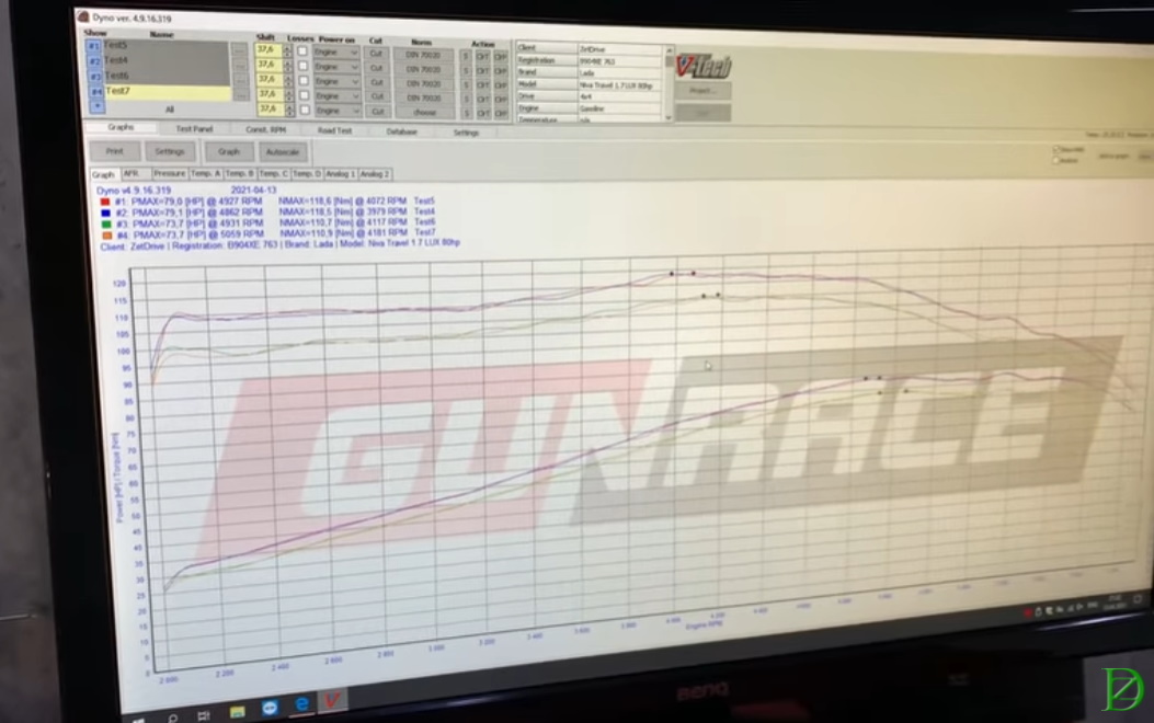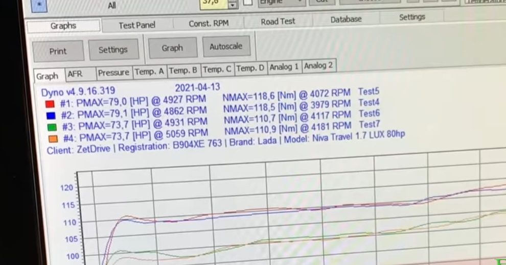 На диностенде было выполнено 4 замера: два замера с выключенным кондиционером и два замера с включенным. В результате определили реальную мощность Lada Niva Travel, она составляет 79 л.с. и 120 Нм крутящего момента (по паспорту 80 л.с. и 127 Нм). Мощность двигателя на колесах - 50 лс и 80 Нм.
