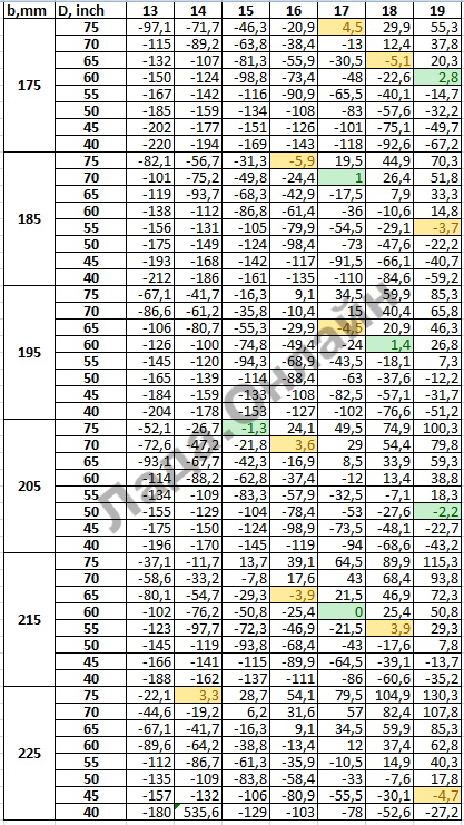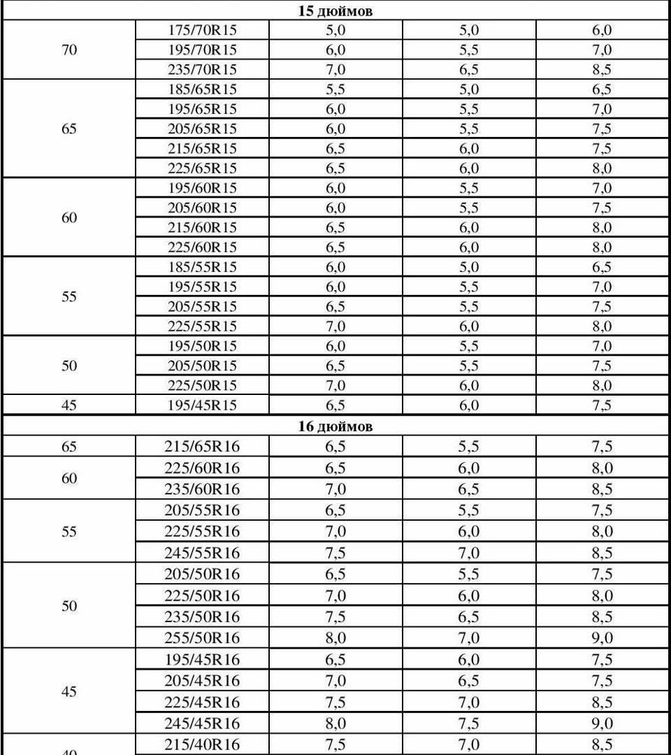 Определяем ширину обода можно по таблице: