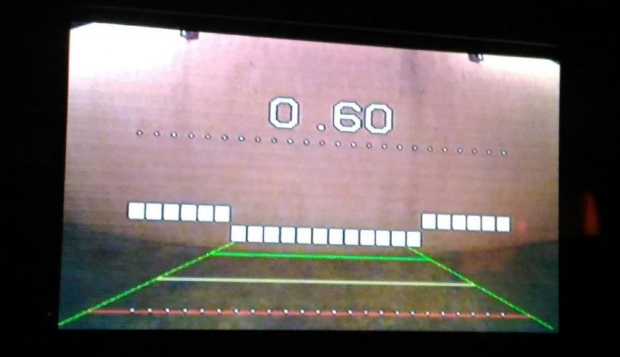 Видеокамера имеет парковочные линии и настроена таким образом, что расстояние от крайней линии зеленого цвета до запасного колеса составляет 60 см., а от ближней линии красного цвета — 30 см.