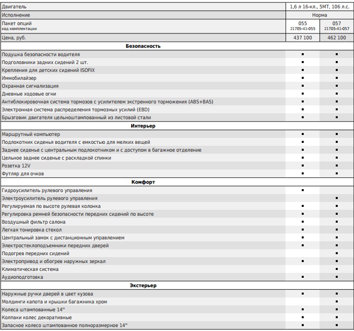 Актуальная информация о комплектациях Приоры на официальном сайте в формате PDF.