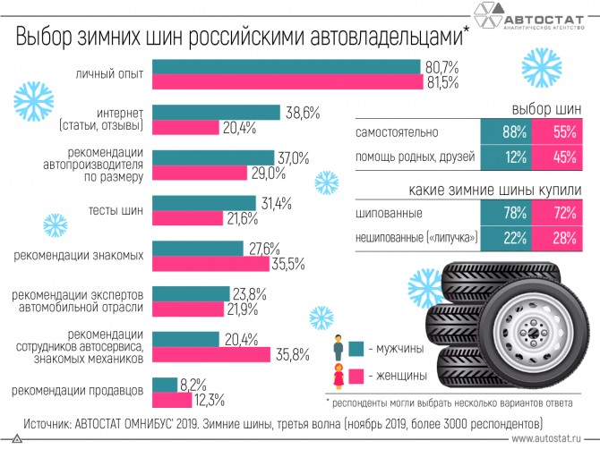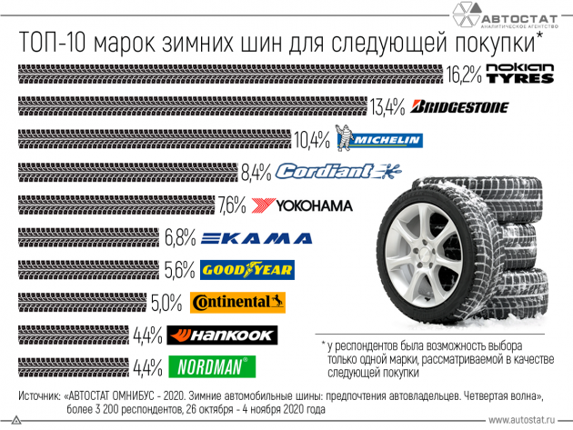 15. Опрос. ТОП-5 марок зимних шин определили в рамках нового исследования «АВТОСТАТ ОМНИБУС – 2018. В опросе участвовало более 3 тысяч автовладельцев. При формировании выборки были учтены квоты по полу (не более 25% женщин-автовладельцев), а также по признакам «возраст автомобиля» и «география проживания респондентов».