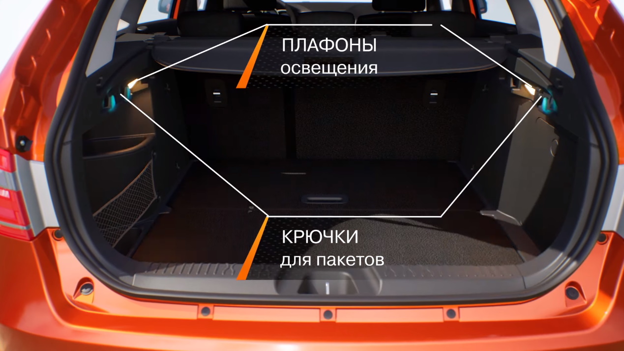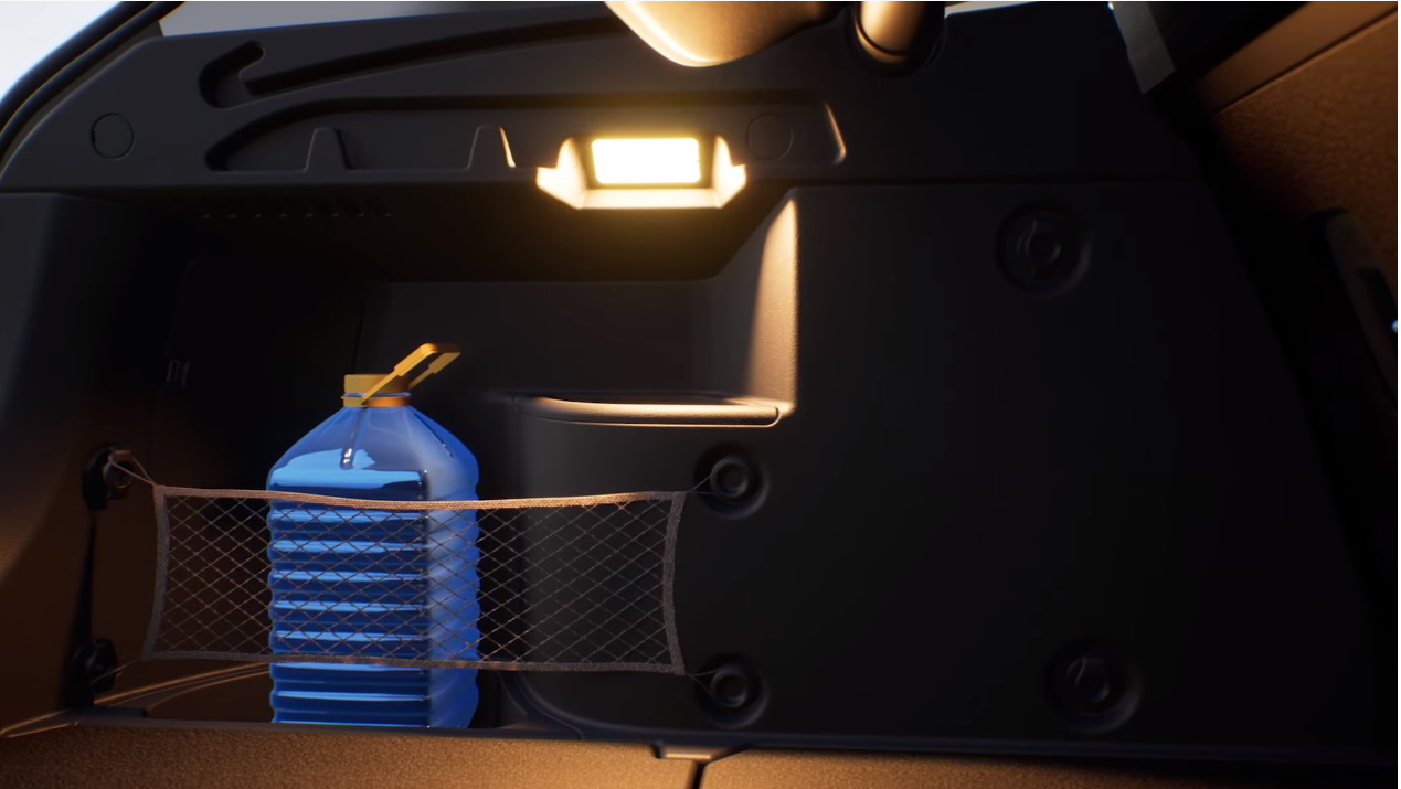 В багажнике есть крючки для пакетов и плафон освещения справа и закрытый отсек, а слева две открытые ниши. В нижнюю отлично помещается стандартная бутыль с незамерзайкой.