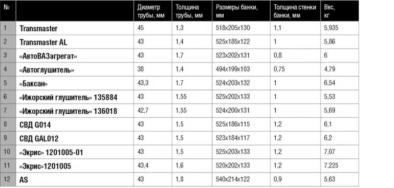 Тест №1. Проверка геометрических размеров и толщин используемого металла, а также измерялся вес каждого глушителя.