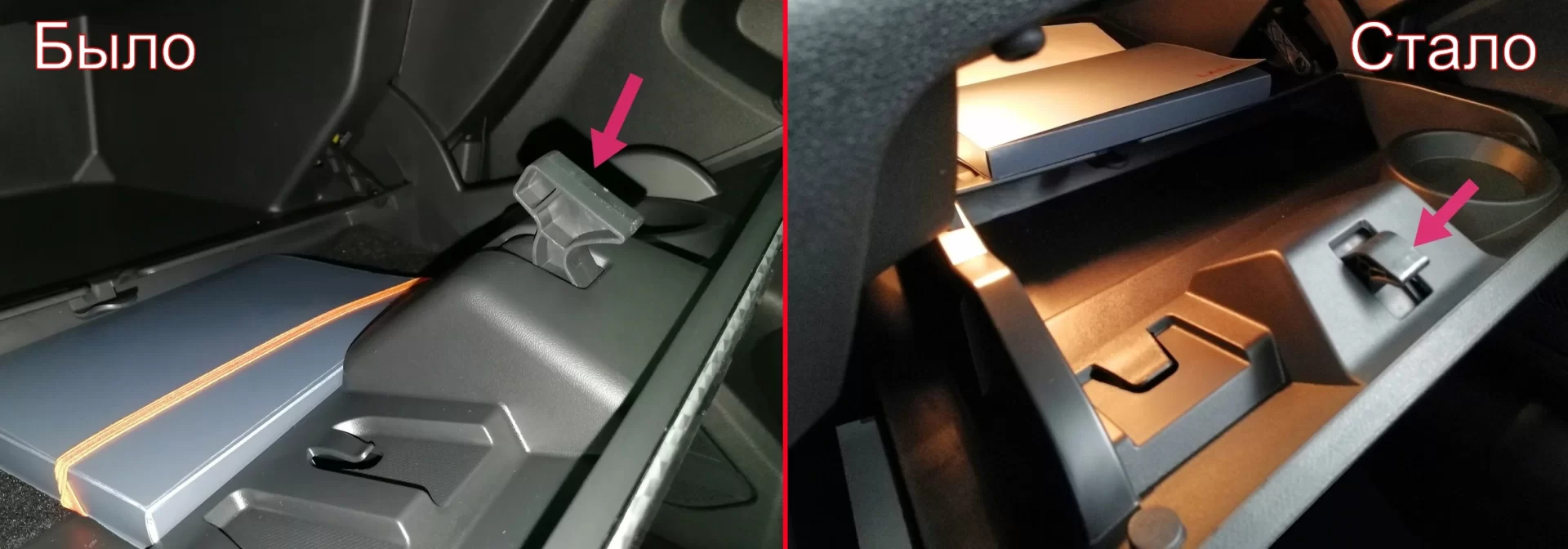 - На крышке бардачка сделали более компактный фиксатор (в предыдущей версии был огромный пластиковый крюк), но при этом и сам бардачок стал немного меньше (уже чем был ранее).
