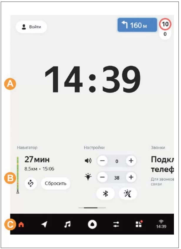 Домашний экран содержит основную (А), дополнительную (B) области экрана и навигационную панель (C). В правом верхнем углу расположена зона с навигационными подсказками. Такие навигационные подсказки отображаются при активной навигации системы Яндекс.Навигатора. В подсказках указаны расстояние до ближайшего маневра, ограничение скорости на данном участке и текущая скорость автомобиля и др. При нажатии на зону навигационных подсказок на дисплее открывается экран Навигатора.