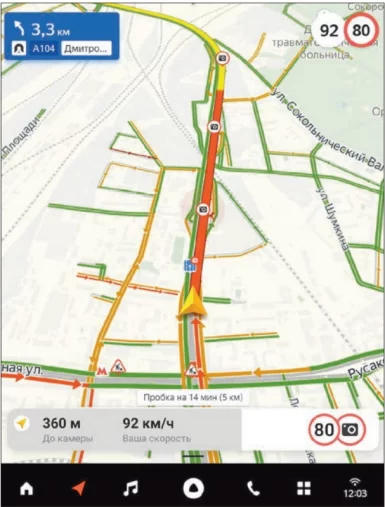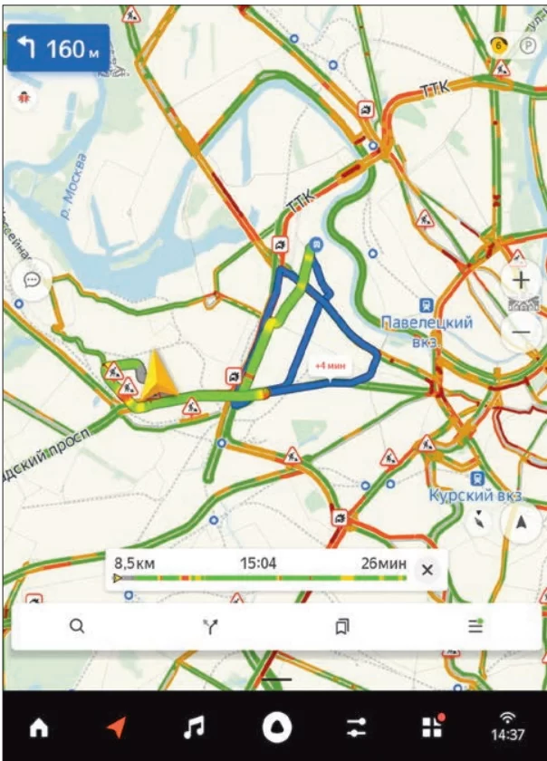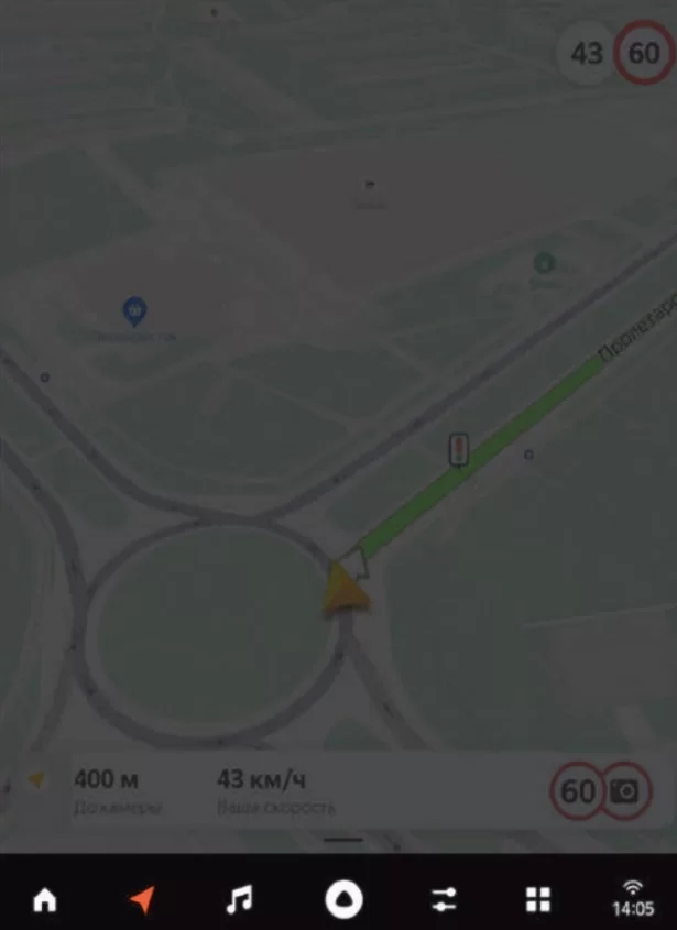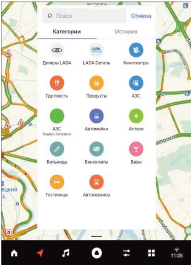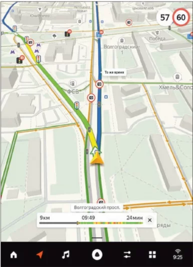 В режиме Навигации на экране приборной отображается динамическая карта Яндекс.Навигатора: