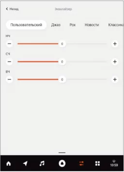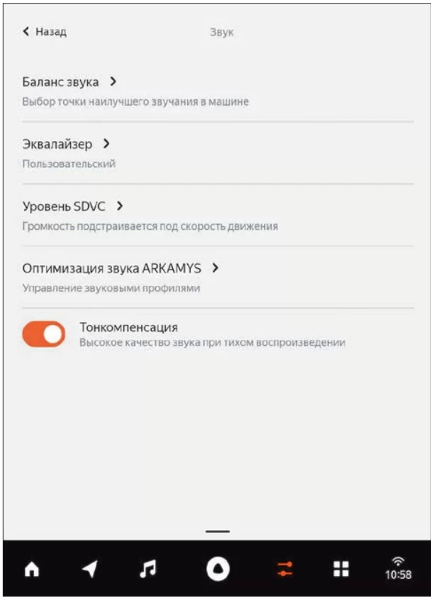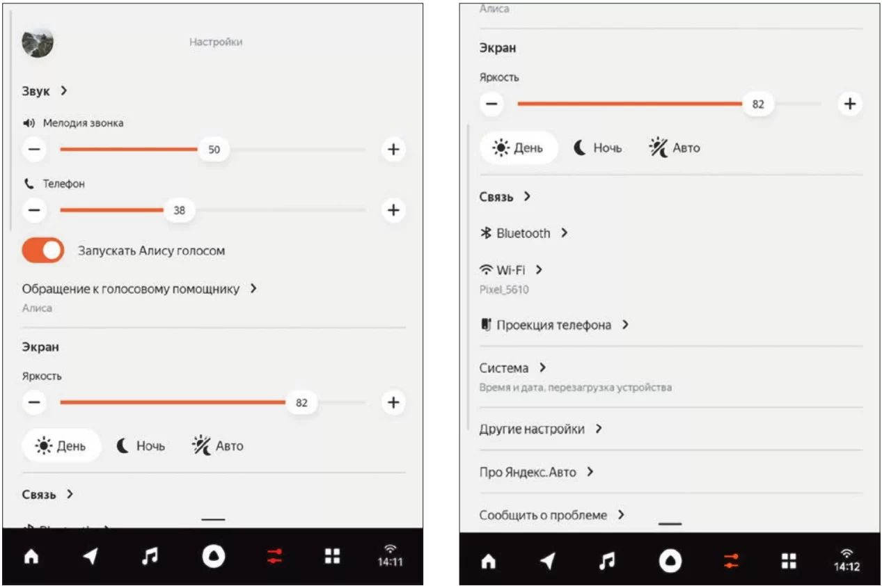 В настройках доступны шкалы для изменения громкости медиа, голосового помощника, входящих вызовов и разговора по телефону (в зависимости от технических особенностей подключаемого телефона громкость мелодии входящего вызова может регулироваться как одной, так и другой шкалой).