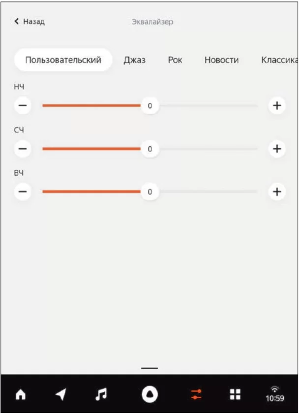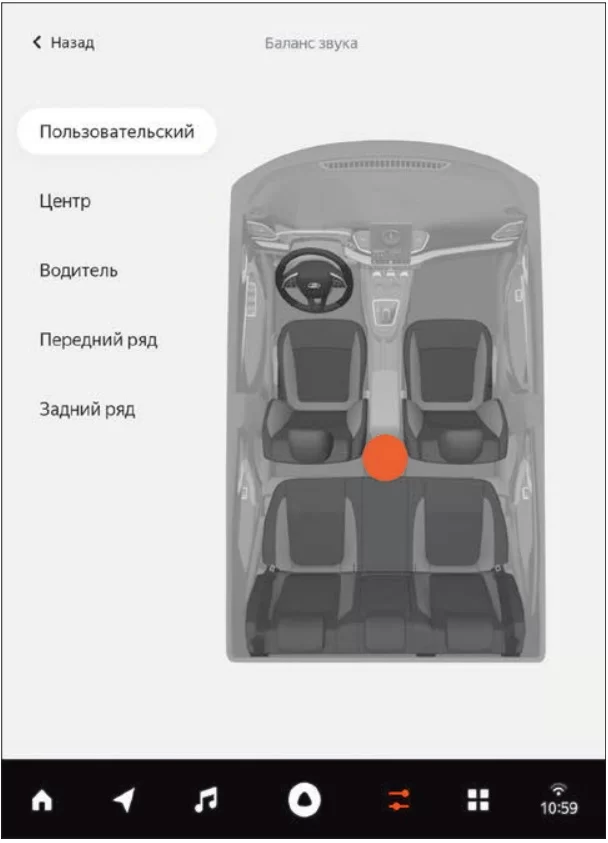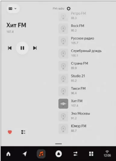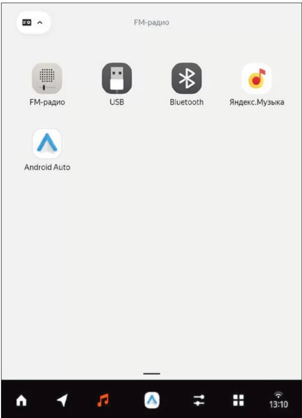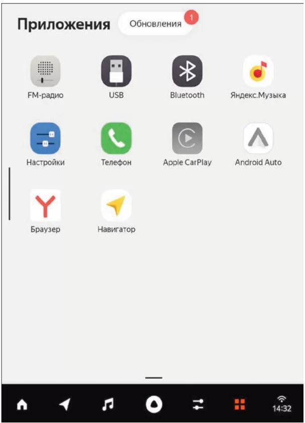 Навигационная панель содержит кнопки быстрого перехода на экраны: «Домашний экран», экран Навигатора, экран Медиаисточников и управления медиа, кнопку вызова голосового помощника Алиса, экран Настроек, экран с Приложениями, экран настроек Подключения к сети, которая, в том числе, показывает состояние подключения.