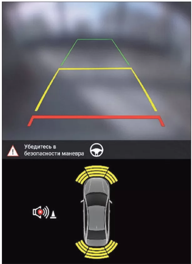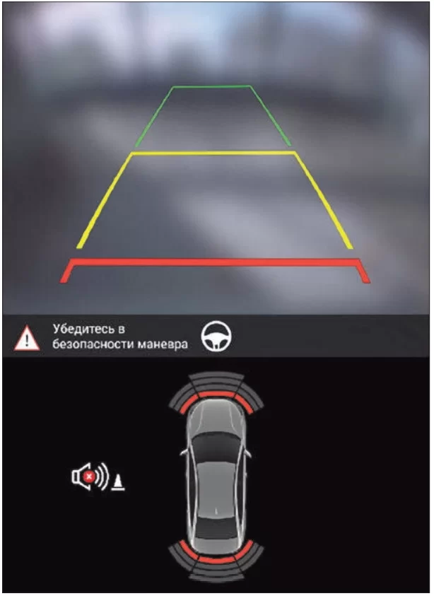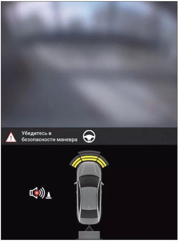 Имеется возможность отключить звуковое оповещение о приближении к препятствию при помощи нажатия на иконку «MUTE» на экране мультимедийной системы.