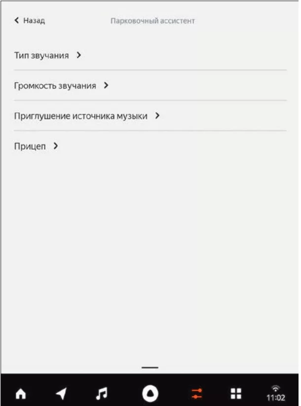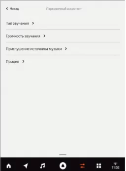 Режим «Прицеп». В данном режиме задние датчики парковочной системы не будут реагировать на подключенный прицеп. В меню настроек парковочного ассистента предусмотрена возможность выбрать один из двух тонов звучания как для передней, так и для задней парковки, громкость звукового оповещения при обнаружении препятствий впереди и сзади автомобиля, определить пороговое значение громкости медиаисточника при маневрировании, выбрать включен или отключен режим «Прицеп».